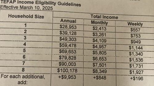 Below are the maximum gross monthly income guidelines for TEFAP: